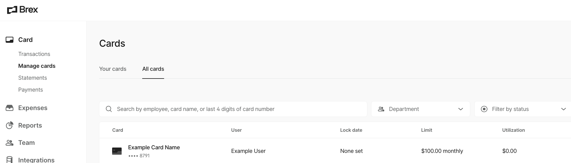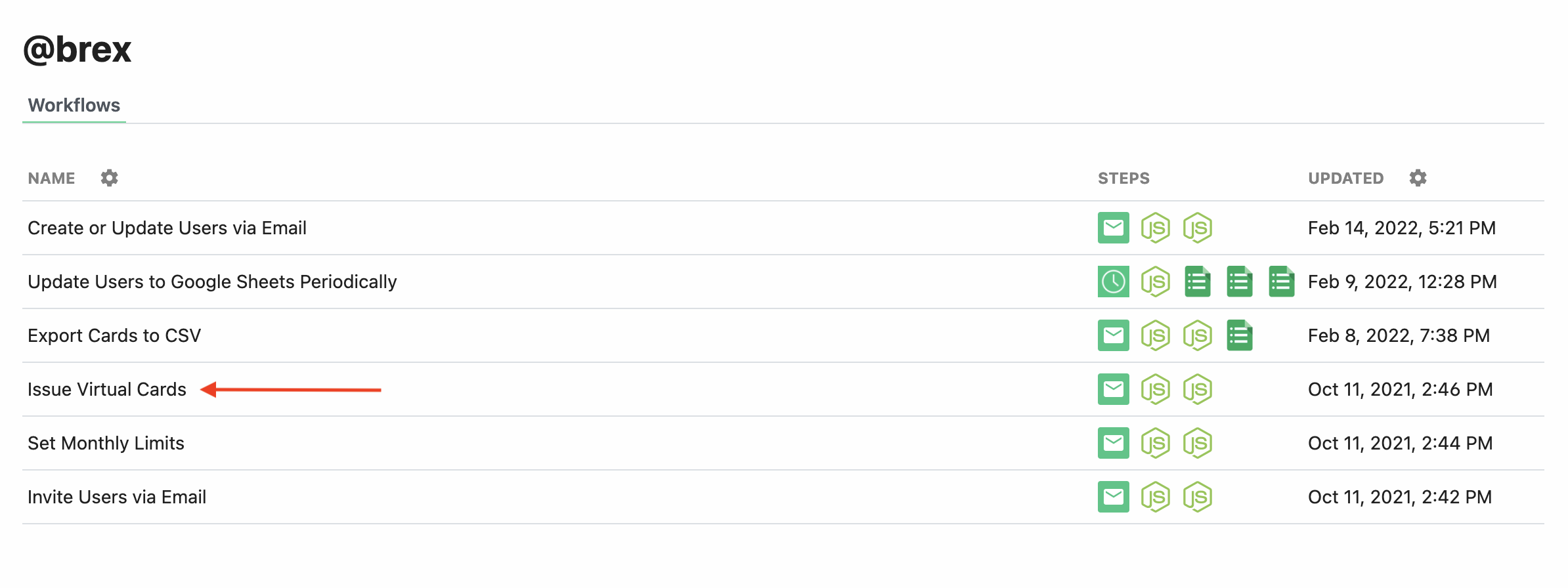 If you don’t already have a Brex account, you can sign up for a Brex account here (subject to financial approvals). After you have a Brex account with the ability to create cards, you can set up the workflow described in this tutorial.