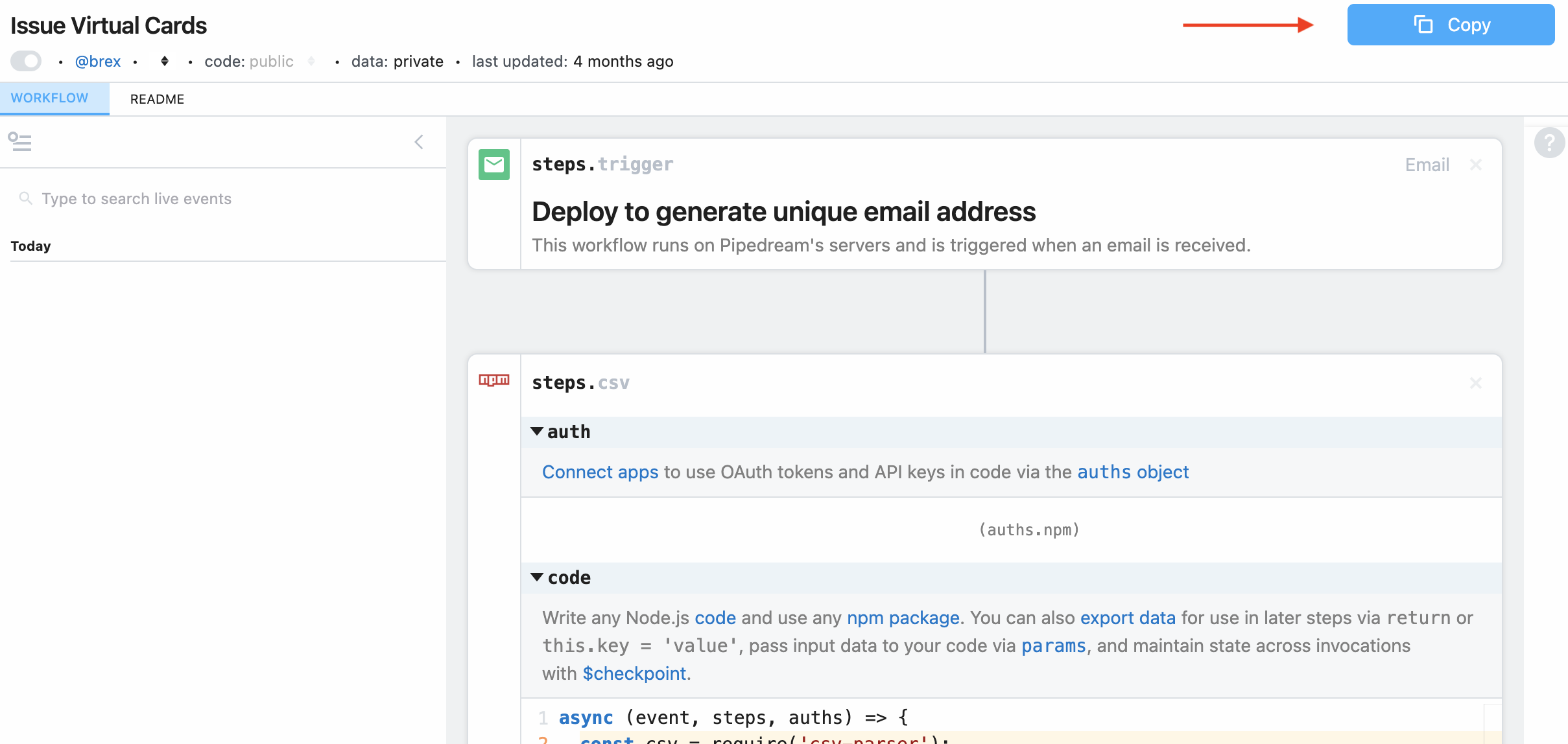 - On the top right of the page, click Copy. This will copy the Issue Virtual Cards template into your Pipedream account.