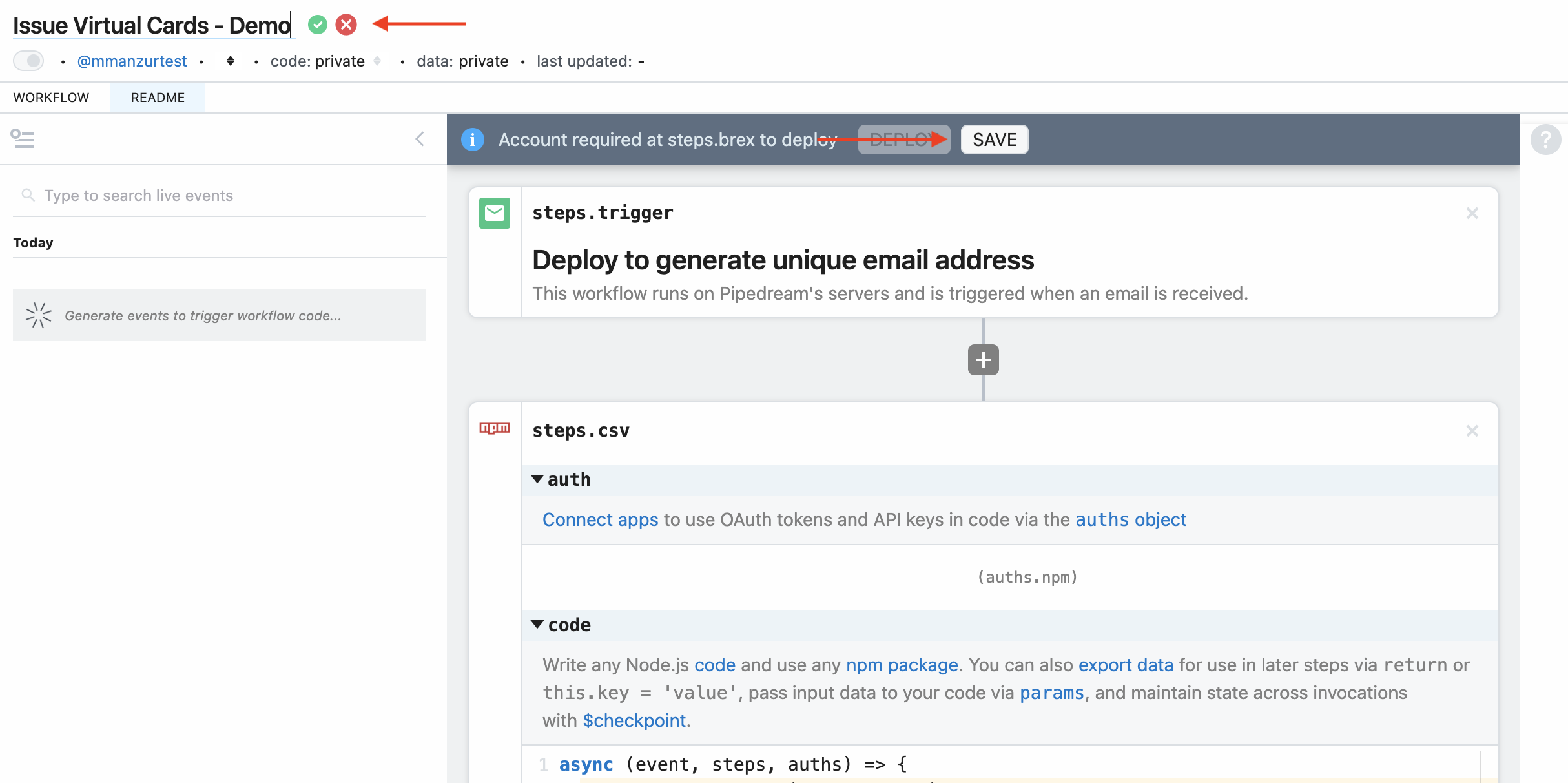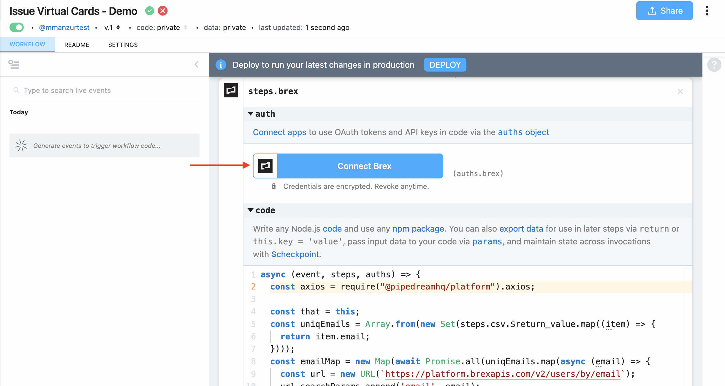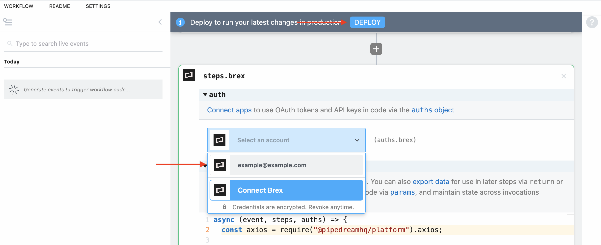 - Navigate back to your Pipedream account to the template you created. Scroll down and choose the Brex account that shows your email. Then click the Deploy button at the top.