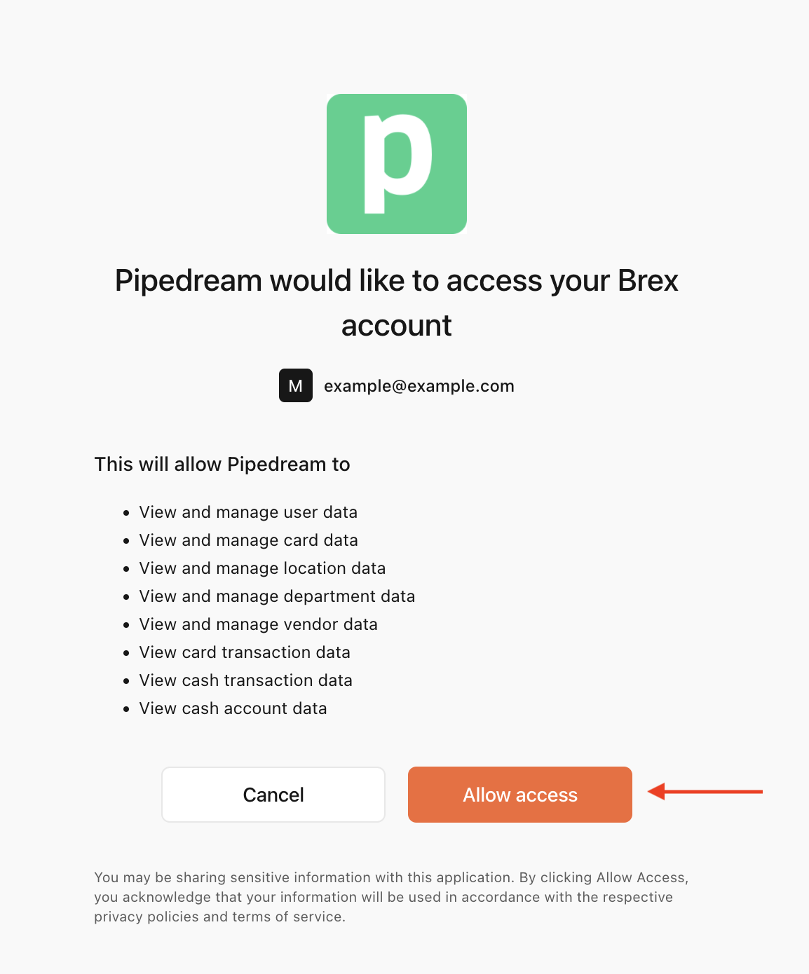 - If you haven’t connected Pipedream to Brex before, scroll down until you see the Connect Brex button. Click this button and then you will be prompted to login to your Brex account. This will give Pipedream read and write access to your Brex account to take actions on your behalf. Please review your organization’s security policy before proceeding.