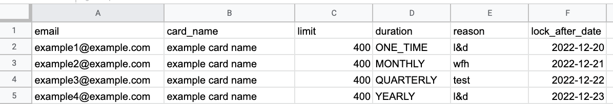 - In a spreadsheet tool like Excel or Google Sheets, create a CSV with the format shown in the screenshot below. The columns needed are: email, card_name, limit, duration, reason, lock_after_date.